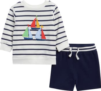 Whether you're setting sail or spending the day on dry land, your little deckhand can show off their seafaring side in this two-piece set with a long-sleeve embroidered shirt and drawstring shorts patterned in crisp nautical stripes.