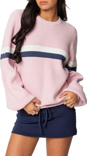 A pair of placed stripes nod to nautical style for a petal pink sweater knit to a slouchy fit and fixed with billowed sleeves.