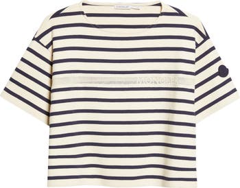 A logo-embroidered macramé inset adds cool (and cooling) detail to this cropped, boxy boatneck T-shirt in summery nautical stripes.
