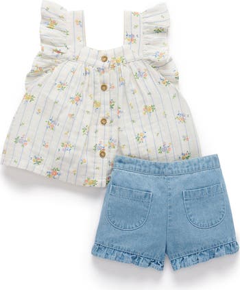 She can play all summer long in our Nautical Floral Set. Featuring a pretty floral and striped top with a ruffle sleeve detail and practical denim shorts with an elasticated waistband. Made from our 100% Cotton for a soft and breathable outfit, perfect for those warm sunny days.