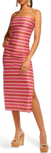 Shimmering chevron stripes brighten this shapely dress meant to show off your shoulders.