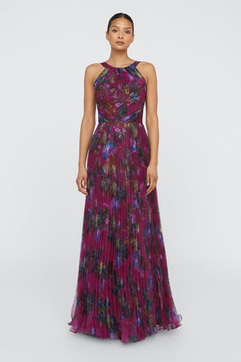 Printed organza gown with a halter neckline and finely pleated A-line skirt. Designed in a rich archival floral, it brings soft structure, texture, and graceful movement. A romantic pick for fall weddings, gallery openings, or gala nights.