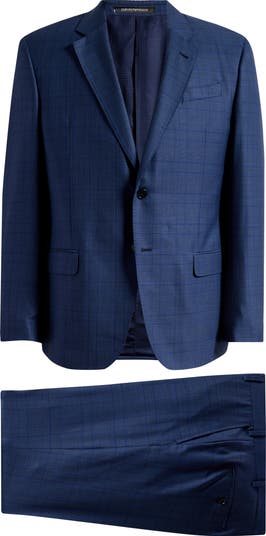 A deep-blue blend of wool and silk patterned in a shadowy windowpane check distinguishes a suit that's softly constructed in the shoulders with a tailored profile for a smart, classic look. The flat-front trousers sit at the waist and complement the traditional detailing to keep the silhouette crisp and clean.