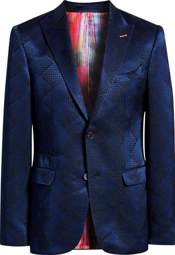 This blazer is fashioned from a textural stretch jacquard fabric with a luminous sheen that elevates it for evening without sacrificing comfort. Peaked lapels and contrast stitching sharpen the look, while the slim, tailored fit delivers structure.