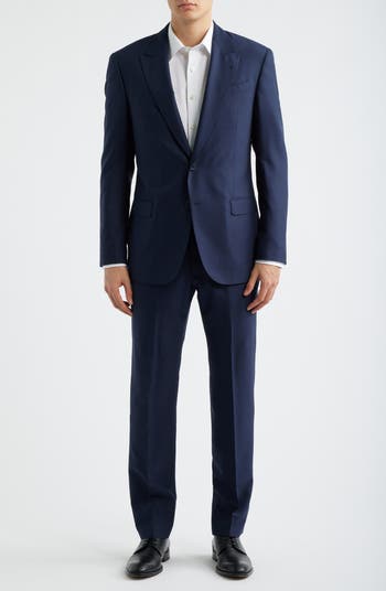 Deep-blue virgin wool patterned in a tiny check distinguishes a suit that's softly constructed in the shoulders with peaked lapels and a tailored profile for a smart, classic look. The flat-front trousers sit at the waist and complement the traditional detailing to keep the silhouette crisp and clean.