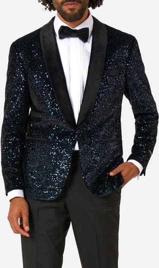 Drenched in midnight-blue sequins, this entrance-making dinner jacket keeps you both elegant and spotlight-ready whenever the occasion calls for formality but requires a touch of festivity. Black satin brings traditional polish to the shawl collar and covered buttons, while an interior patch offers helpful instructions for navigating your way through the plates, glasses and silverwear set in front of you for a fancy dinner.