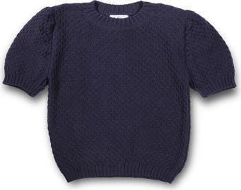 Classic and versatile, this navy cotton sweater is designed with puff sleeves and a textured knit for a touch of playful sophistication. The short-sleeve silhouette makes it perfect for layering over blouses or pairing with skirts and pants for year-round wear. Crafted from 100% cotton, it’s soft, breathable, and polished enough for special occasions while remaining comfortable for everyday moments. A timeless wardrobe staple that blends cozy texture with picture-perfect charm. Navy sweater knit, 100% cotton, puff sleeves, textured knit.