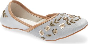 Shimmering beads and embroidery stun on an artisan-crafted flat fashioned with a lightly cushioned footbed for added comfort.