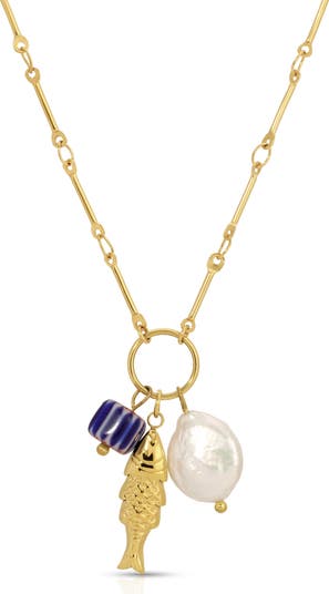 A trio of sea-inspired charms swims at the center of this playful necklace plated in 14-karat gold.