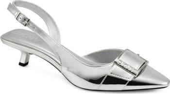 An oversized logo-embossed buckle highlights the pointed toe of this chic slingback pump propped up on a kitten heel.
