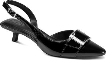 An oversized logo-embossed buckle highlights the pointed toe of this chic slingback pump propped up on a kitten heel.