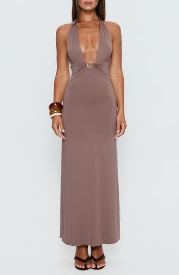 Swirling hardware centers this plunging halter maxi dress made from stretch-kissed jersey that hugs your curves.
