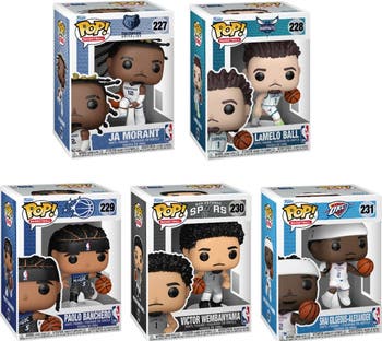 NBA Series 16 Funko Pop! Complete Set (5). Includes Ja Morant (Memphis Grizzlies), Lamelo Ball (Charlotte Hornets), Paolo Banchero (Orlando Magic), Victor Wembanyama (San Antonio Spurs), and Shai Gilgeous-Alexander (Oklahoma City Thunder). Each comes individually packaged in a Funko Pop window display box.
