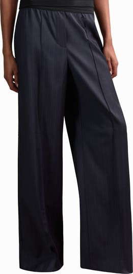 Classic pinstripes get slightly less serious in a pair of wool-enriched pants shaped with drape and topped with a comfy contrast elastic waist.