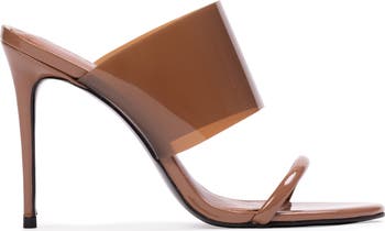 - Round toe sandal with a padded front strap and pvc upper detail, set on a straight stiletto heel.