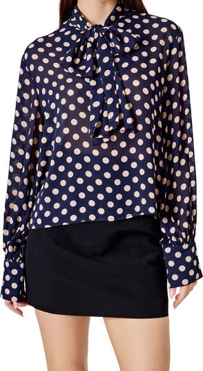 A delightful neck tie adds polish and charm to this fluid top covered in vivacious dots.