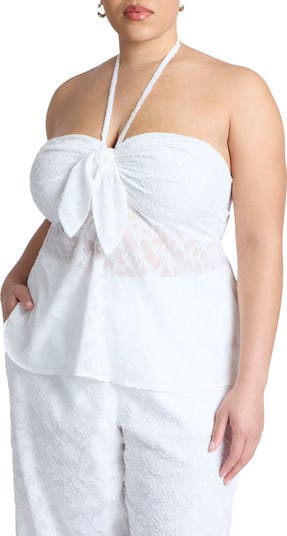 A halter-sweetheart top with keyhole tie detail and a graceful, below-hip length.