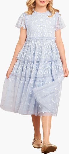 This enchanting dress combines vintage-inspired elegance with playful charm. Delicate, intricate embroidery, reminiscent of classic Victorian lace trims, adorns the bodice, while soft tiered frills bring a touch of whimsy and movement. Crafted to capture timeless beauty, this dress is the perfect addition to your little one’s wardrobe—ideal for special occasions and everyday magic.