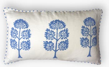 Inspired by the American Birch tree, reimagined in a coastal blue for contemporary homes. The Neera Lumbar Throw Pillow Cover brings together bold simplicity and detailed craftsmanship. Hand-block printed by skilled Indian artisans, each tree motif stands crisp and symmetrical on breathable natural linen, offering a piece that feels grounded, and graceful. Whether placed on a sofa, reading nook, or layered with warm neutrals, this cover adds a quiet, elevated edge to any setting. Material: Pure Linen Size: 12 x 20 in (Pillow insert not included) What Makes It Special? - - Handmade by artisans using age-old block-printing techniques - - Concealed zipper - - Highly absorbent, breathable & moisture-wicking - - Sustainably produced Please note: Each piece is handcrafted by skilled artisans, so slight variations in color and pattern are natural - and part of what makes it uniquely yours.
