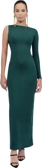 Our Negrete long dress allures to the ever changing nature of fall, with a dramatic open back, an asymmetric neckline featuring a twisted shoulder detail and a long and glossy sleeve, wrap up in a column silhouette that falls hugging the body in all the right places.