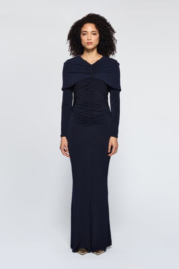 Neli Dress - A maxi dress designed with a dramatic cape shoulder detail for elevated elegance.