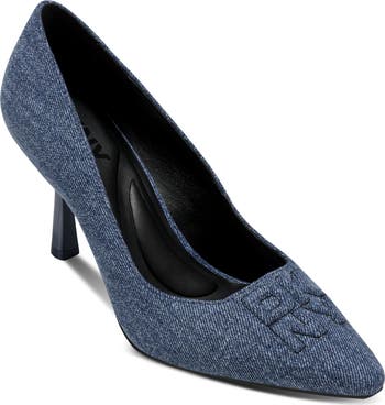 An embossed logo authenticates this denim pump fronted by a snip toe and balanced on a sculptural heel.