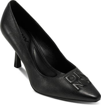An embossed logo authenticates this soft leather pump fronted by a snip toe and balanced on a sculptural heel.