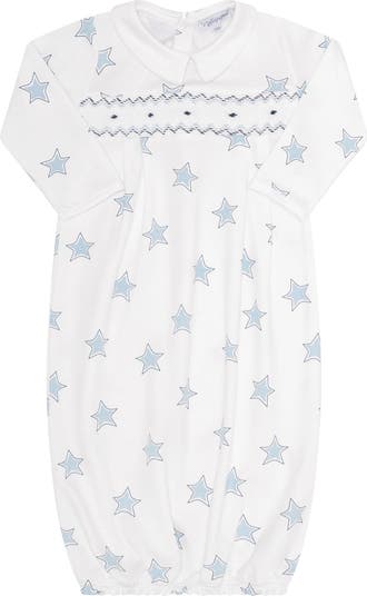 Is now available in three charming colors: gray, pink, and blue! This dreamy gown features a playful print of stars against a soft, soothing background, while the long sleeves and elasticized bottom ensure a snug and secure fit, perfect for a peaceful night's sleep or relaxed lounging at home.
