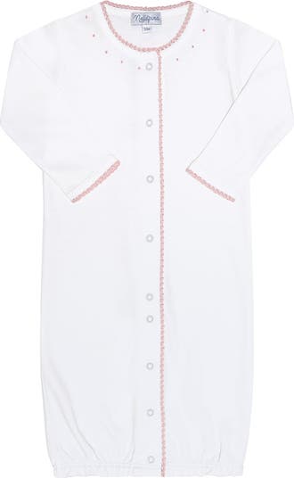 Crafted from the finest pristine white Pima cotton, this gown offers unparalleled softness and durability, making it a timeless addition to any wardrobe.The gown features exquisite handmade pink crochet design on the top left side, adding a touch of artisanal charm and whimsy, enhancing its beauty.Designed with practicality in mind, the gown simplifies diaper changes, making it an essential piece for parents. The easy-to-use converter allows for quick and hassle-free adjustments, ensuring both you and your baby remain comfortable throughout the day.