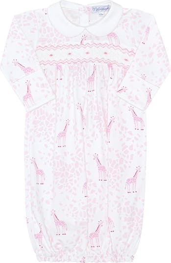Pink Giraffe Print Smocked Gown, a timeless blend of elegance and comfort designed to cradle your precious one in a world of softness. Available in sizes 0 to 6 months, this gown embodies the perfect harmony of style and practicality for your littlest bundle.