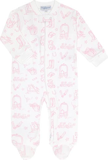Wrap your baby in comfort and frontier flair with this zipper footie in our Lone Star Toile print. Crafted from 100% Peruvian Pima cotton, it’s ultra-soft and gentle on delicate skin. The 2-way zipper allows for quick and easy changes without fully undressing your little one — especially helpful during nighttime routines. Enclosed feet provide warmth and coziness, while the soft pink Western motifs add a touch of playful storytelling. A practical and beautiful piece for sleep or gifting.