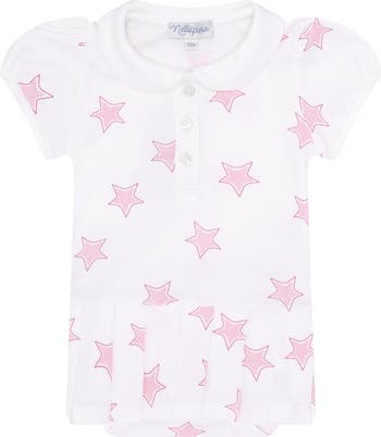 A delightful combination of comfort and charm for your little one! This adorable dress features a crisp white background adorned with playful pink stars, creating a whimsical and stylish look. It is a versatile and adorable addition to your baby's wardrobe.