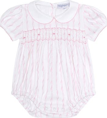 This charming piece features a delightful pink twirl pattern, perfect for adding a touch of sweetness to any occasion. The pristine white round collar and soft, elegant hand-smocked detailing on the chest area elevate this bubble to a truly special outfit.