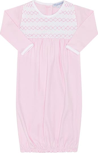 A timeless baby gown crafted from 100% Pima cotton and finished with a generously proportioned, 100% hand-smocked panel across the chest. The wider smocking allows the fabric to drape softly, providing a relaxed and flexible fit that moves comfortably with baby and adapts beautifully as she grows. Designed especially for newborn comfort, this gown features long sleeves, gentle gathers, and an elasticized bottom for easy diaper changes. Exceptionally soft, breathable, and gentle on delicate skin, it is ideal for sleep, lounging, everyday wear, or gifting. Made from premium Pima cotton, this classic pink baby gown combines heirloom craftsmanship with modern practicality, making it a must-have essential for newborns and infants. Details: 100% Pima cotton 100% hand smocked Generous smocked panel for comfort and flexibility Soft, breathable, and lightweight Elasticized bottom for easy changes Button closure at back Color: Pink & White
