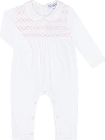A timeless baby girls playsuit crafted from 100% Pima cotton and finished with a generously proportioned, 100% hand-smocked panel across the chest. The wider smocking allows the fabric to drape softly, offering a comfortable and flexible fit that moves naturally with baby and adapts beautifully as she grows. Designed with a classic Peter Pan collar, long sleeves, and gentle gathers, this playsuit combines heirloom-inspired elegance with everyday practicality. Exceptionally soft, breathable, and gentle on delicate skin, it is ideal for daily wear, special occasions, or gifting. Snap closures along the legs ensure easy diaper changes without compromising style. Made from premium Pima cotton in soft pink and white tones, this baby playsuit is a refined essential for newborns and infants. Details: 100% Pima cotton 100% hand smocked Generous smocked panel for comfort and flexibility Soft, breathable, and lightweight Peter Pan collar Snap closures for easy diaper changes Color: Pink & White