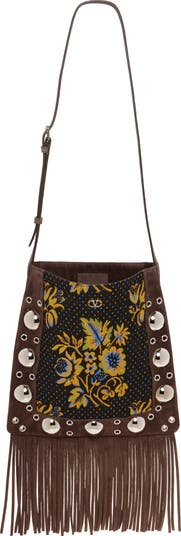 A signature VLOGO and boldly oversized studs and grommets amp up the hardware shine of this suede-trimmed floral-jacquard crossbody cascading with bohemian fringe.