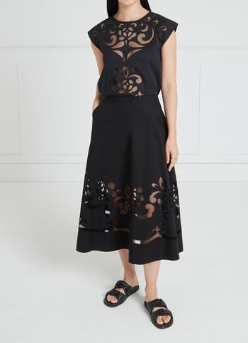 Showcasing our elegant engineered broderie anglaise design, the crisp cotton Nelle skirt features a full, voluminous silhouette, creating a a shape of airy femininity. Pair it with one of the matching tops for an effortlessly polished summer look. This custom broderie anglaise design features floral motifs to a lace-like effect. It has been expertly engineered to compliment the garment’s silhouette