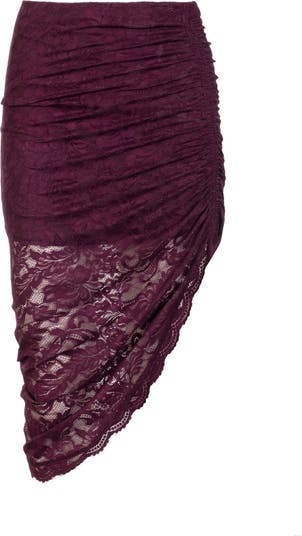 The Nellia Lace Skirt is feminine sophistication at its best. Crafted in rich aubergine floral lace, this fitted silhouette is ruched for a flattering effect and finished with an asymmetrical hemline for modern edge. Style it with the matching Safia Lace Top for a polished set, or pair with a sleek cami and heels for chic evening allure. Self: 92% Nylon, 8% Elastane Lined: 92% Polyester, 8% Elastane Hand Wash Cold, Lay Flat To Dry Style is Running Big, Recommend Sizing Down for Slim Fit Length: 37” Style: K00273045 Model Size & FitModel wears: US 2/XS / UK 6 / EU 34 Model's height: 5'10″ / 178cm