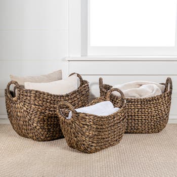 Our set of three woven storage totes will organize your living room, bedroom, office or nursery in classic farmhouse style. Hand-woven from natural hyacinth fibers, they have a stylish curved shape and circular handles. Use these versatile baskets to collect toys and blankets, organize the changing table or gather craft supplies.