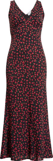 A pretty print covers this slinky maxi dress cut in a sleeveless silhouette and cinched at the waist by a back tie accent.
