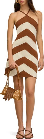 This geometric dress knit with diagonal mitered stripes is finished with a halter-style neckline for a bold sunny-day look.