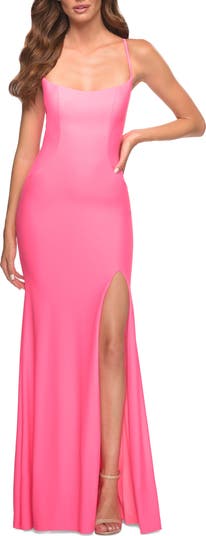 Luxurious jersey dress with modified square neckline and slit in neon color. Open back with adjustable ties. Back zipper closure.