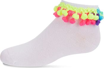 What kid doesn't love the fun of pom poms? With our Neon Multi Pom Pom Anklet Sock, they can get the fun of a cool looking sock while also benefitting from a comfortable, classic fit and feel. White ankle socks are decorated with tassels of neon-colored pom poms around the cuff, for a carnival feel that will make any kid who's wearing them feel festive and special. A cotton blend makes this a feel-good sock that can be worn all day long.