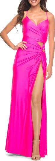 Fabulous cut out prom dress with high slit and strappy lace up back. Ruching around the two cut outs at the hip. Back zipper closure.