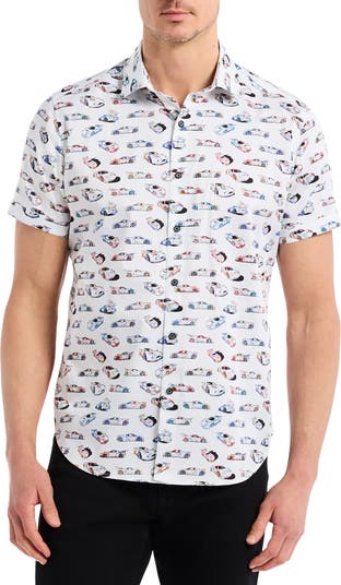 Claim your place in the fast lane wearing this stretch-enhanced cotton sport shirt featuring a print of neon-hued race cars and faded paisley contrasts under the collar and cuffs.