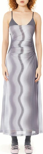 The color is muted but the pattern is mesmerizing across a mesh dress shaped with ruching at the waist.