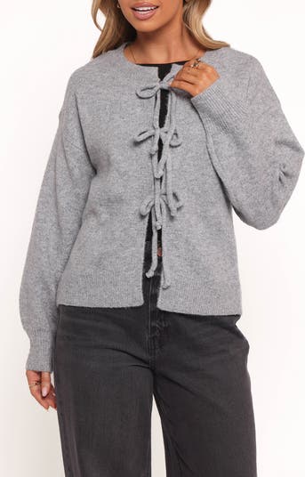 Dainty front bows enhance the charm of this woolly cardigan framed by dropped shoulders for a relaxed fit.