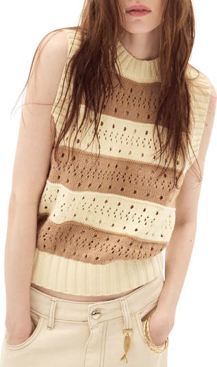 Extend sweater season in a vest option knit with an airy open stitch from a cotton-forward yarn blend.
