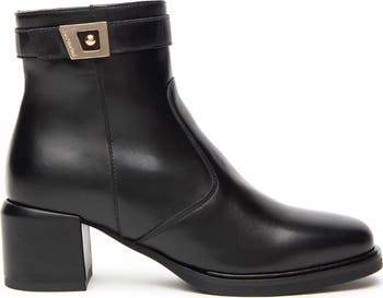 Logo-etched hardware provides a signature finish for a block-heel bootie fashioned from smooth Italian leather.
