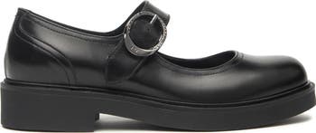 A crystal-encrusted buckle highlights the mary jane strap of this outfit-defining flat fashioned from smooth Italian leather.